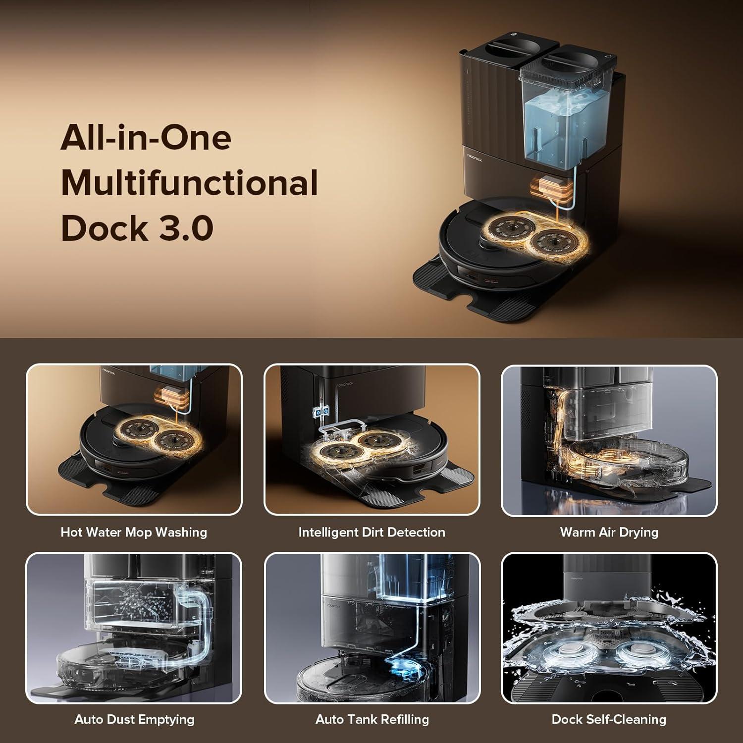 Multifunctional Dock 3.0 – Upgrade to unmatched convenience with our advanced docking station. Intelligent Dirt Detection uses hot water for a thorough mop rinse and revisits heavily soiled areas for spotless floors. The hot water mop wash and 113°F warm air drying keep the mop fresh and ready. Enjoy 7+ weeks without emptying thanks to automatic dust collection and water replenishment. The dock's self-cleaning feature reduces maintenance, ensuring top performance.