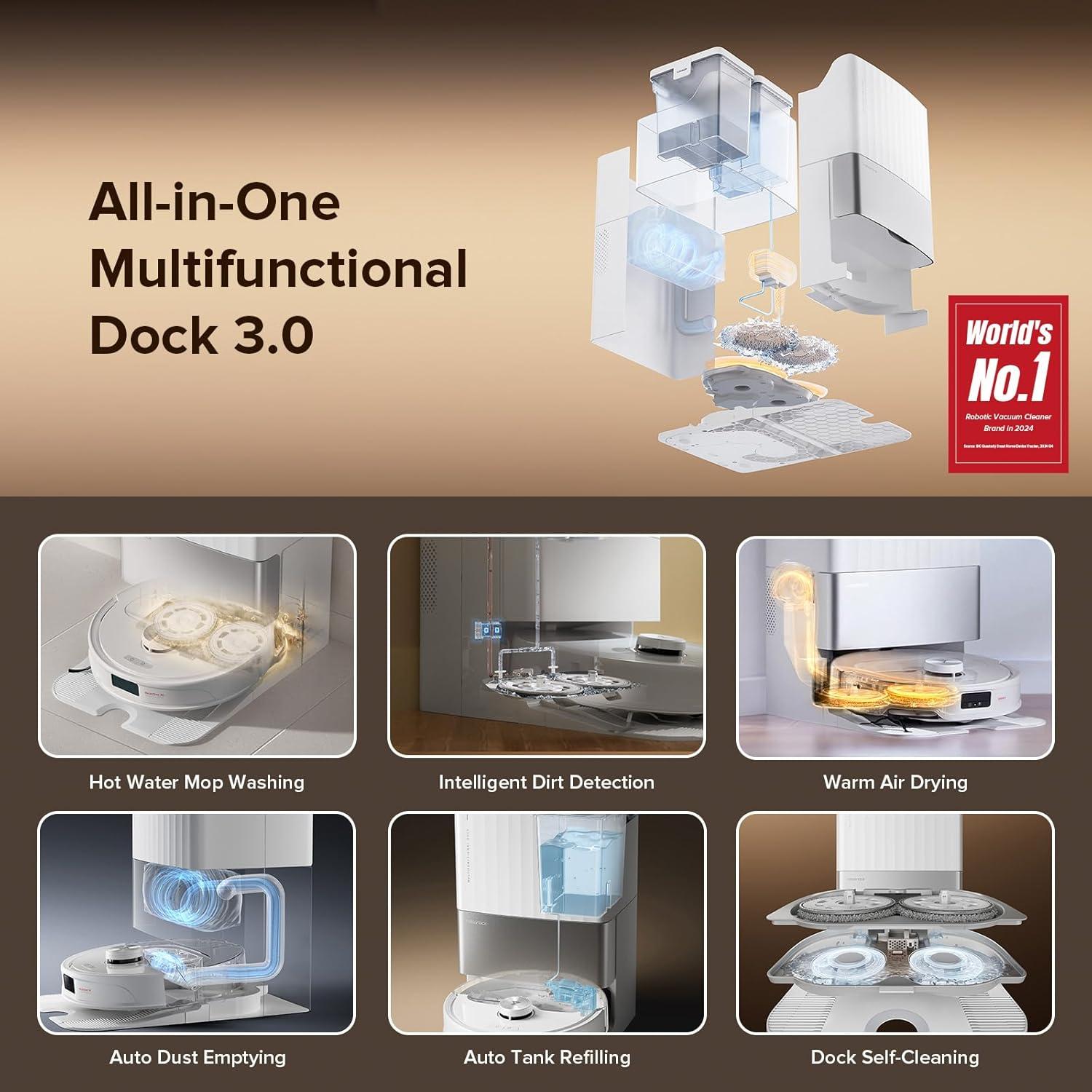 Multifunctional Dock 3.0 – Upgrade to unmatched convenience with our advanced docking station. Intelligent Dirt Detection uses hot water for a thorough mop rinse and revisits heavily soiled areas for spotless floors. The hot water mop wash and 113°F warm air drying keep the mop fresh and ready. Enjoy 7+ weeks without emptying thanks to automatic dust collection and water replenishment. The dock's self-cleaning feature reduces maintenance, ensuring top performance.