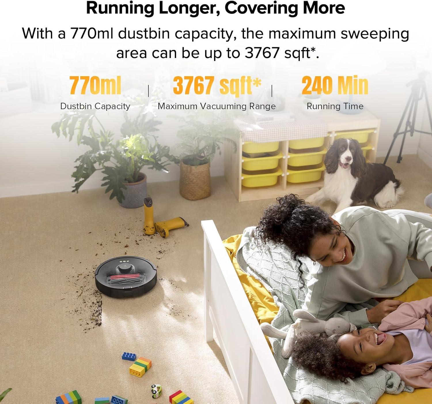 Multifunctional Dock – Hassle-Free Cleanliness: Bid farewell to manual labor. The Q Revo dock features Auto Mop Washing, eliminating the need for hands-on cleaning, and Hot Air Drying to prevent unpleasant odors. With a 5L water tank that refills automatically, the robot covers a vast 4305 sqft mopping range. Self-emptying allows you to enjoy up to 7 weeks of hands-free cleaning, and the easily detachable dock base allows for convenient and thorough cleaning.