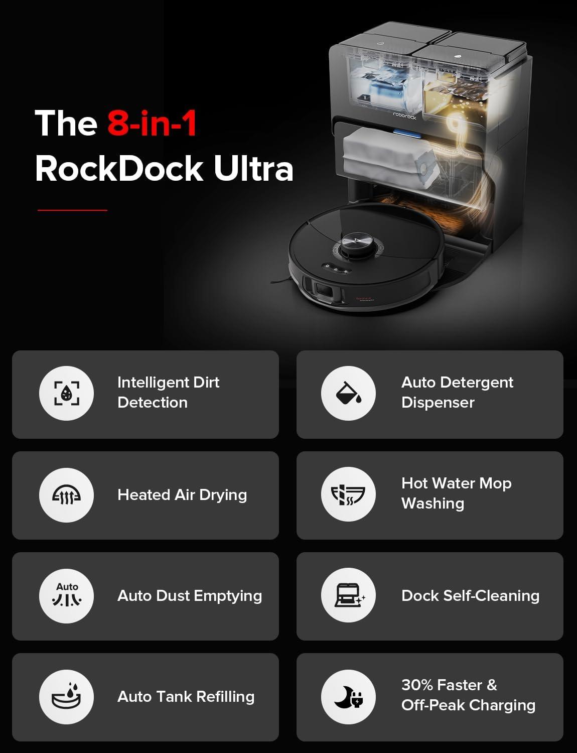 All-in-One Dock: Experience automatic emptying alongside hot water mop washing and drying capabilities. Get immaculately clean floors and mops with Intelligent Dirt Detection that re-washes mops until clean as well as re-mops dirty areas for extra cleanliness. With robot water refilling, detergent dispensing, fast charging, dock self-cleaning, and off-peak charging features, enjoy a worry-free cleaning experience like never before. The dock also offers self-cleaning for minimum maintenance.