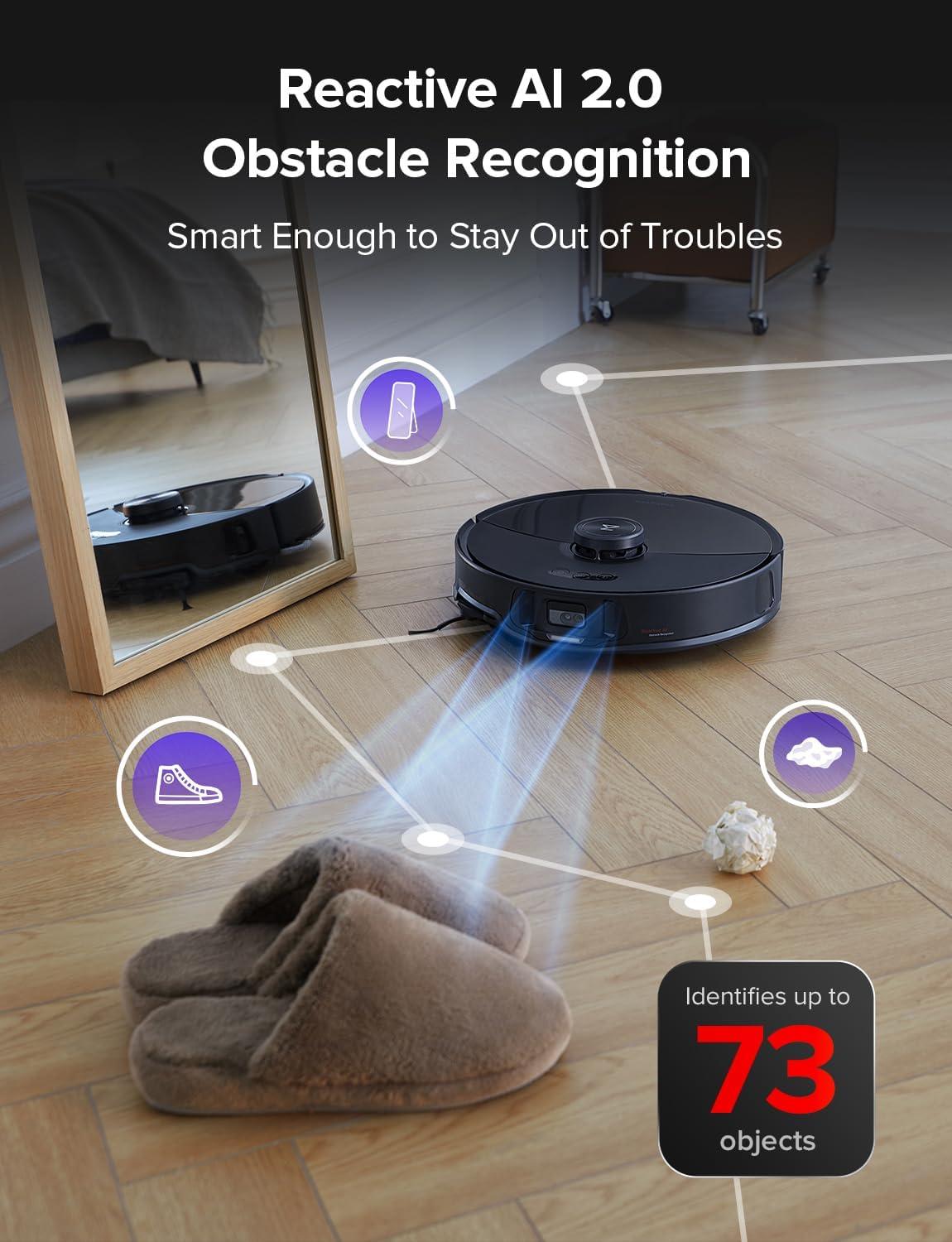 Reactive Al 2.0 Obstacle Recognition and PreciSense LiDAR Navigation : With advanced 3D structured light and an RGB camera to effortlessly identify various floor and room types. This sophisticated system allows the robot vacuum to skillfully identify up to 73 objects such as shoes, pet waste, and floor mirrors, and navigate as needed, ensuring a carefree cleaning experience without interruptions or collisions. Utilizes advanced scanning technology to create detailed maps of the cleaning area in real-time. With 6x Faster Mapping, 3D Map Display, and Multi-Level Mapping your cleaning route is optimized for the best cleanup.