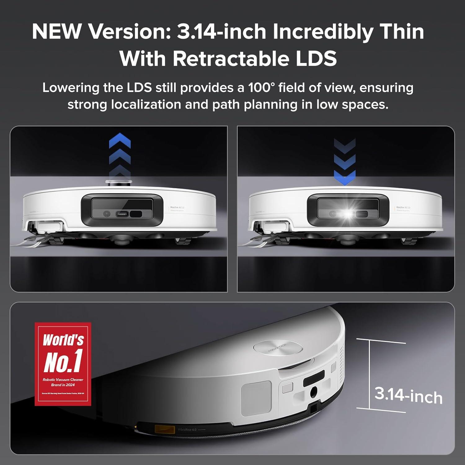 Reach the Unreachable: Featuring a sleek 3.14-inch ultra-thin design, the retractable LDS and RGB camera collaborate for optimal Dirt Detection. The top-mounted ToF sensor smartly adjusts the LDS height, maintaining a 100° viewing angle even in low-light and tight spaces for comprehensive cleaning coverage.