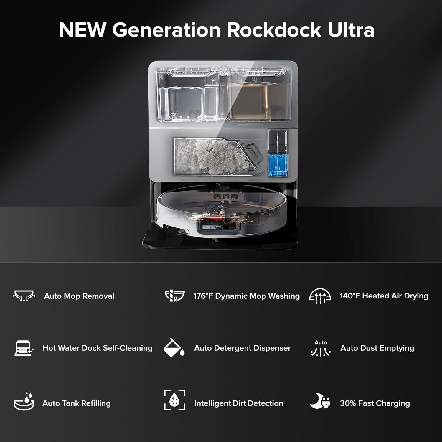 New Gen Powerful Rockdock: The New Generation RockDock Ultra is an advanced docking station featuring 176°F hot water mop washing, dynamic temperature settings for different stains, 140°F heated air drying, and self-cleaning with warm water. It includes an intelligent dirt detection system, auto detergent dispenser, self-refilling, fast charging, and off-peak charging, ensuring a spotless home with minimal effort.
