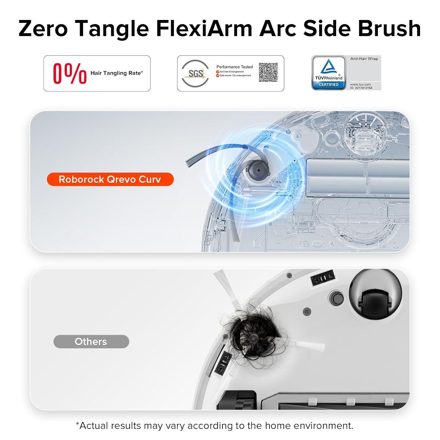 Zero-Tangling FlexiArm Arc Side Brush: The unique arc-shaped asymmetric brush harnesses centrifugal force to prevent hair tangling, guiding it effortlessly to the bristle ends. SGS and TUV certified, this design ensures efficient and tangle-free cleaning.